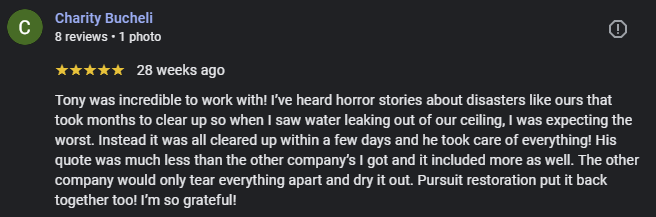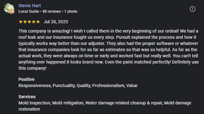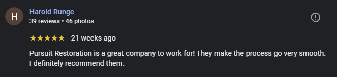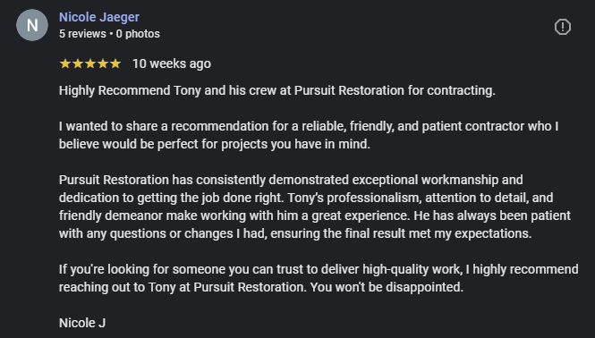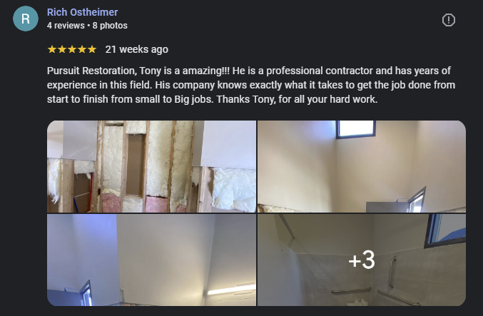 At Pursuit Restoration, we take pride in providing exceptional restoration, remediation, and reconstruction services to our customers. We would be grateful if you could share your thoughts about our business with others. Your feedback helps us improve and aids others in making more informed decisions. Please take a moment to leave a review of Pursuit Restoration and let others know what you think.